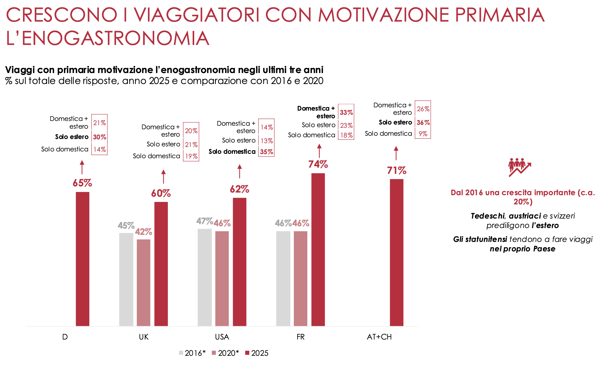 Cresce la percentuale dei viaggiatori che vedono l’enogastronomia come motivazione primaria del viaggio.