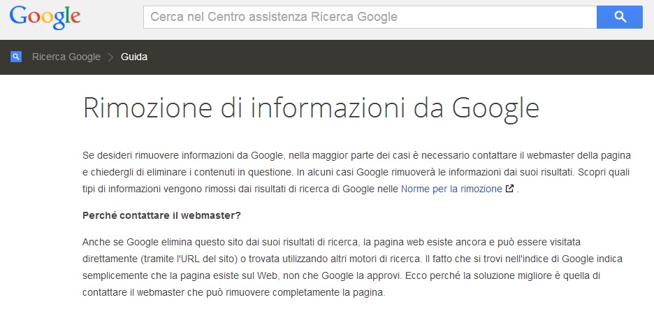 Google, ben prima della sentenza della Corte Ue, ha predisposto una pagina dedicata che va fatta scorrere in tutta la sua lunghezza fino a giungere all’ultimo link, ossia “È possibile visitare lo strumento per la risoluzione dei problemi relativi alle rimozioni per motivi legali”.