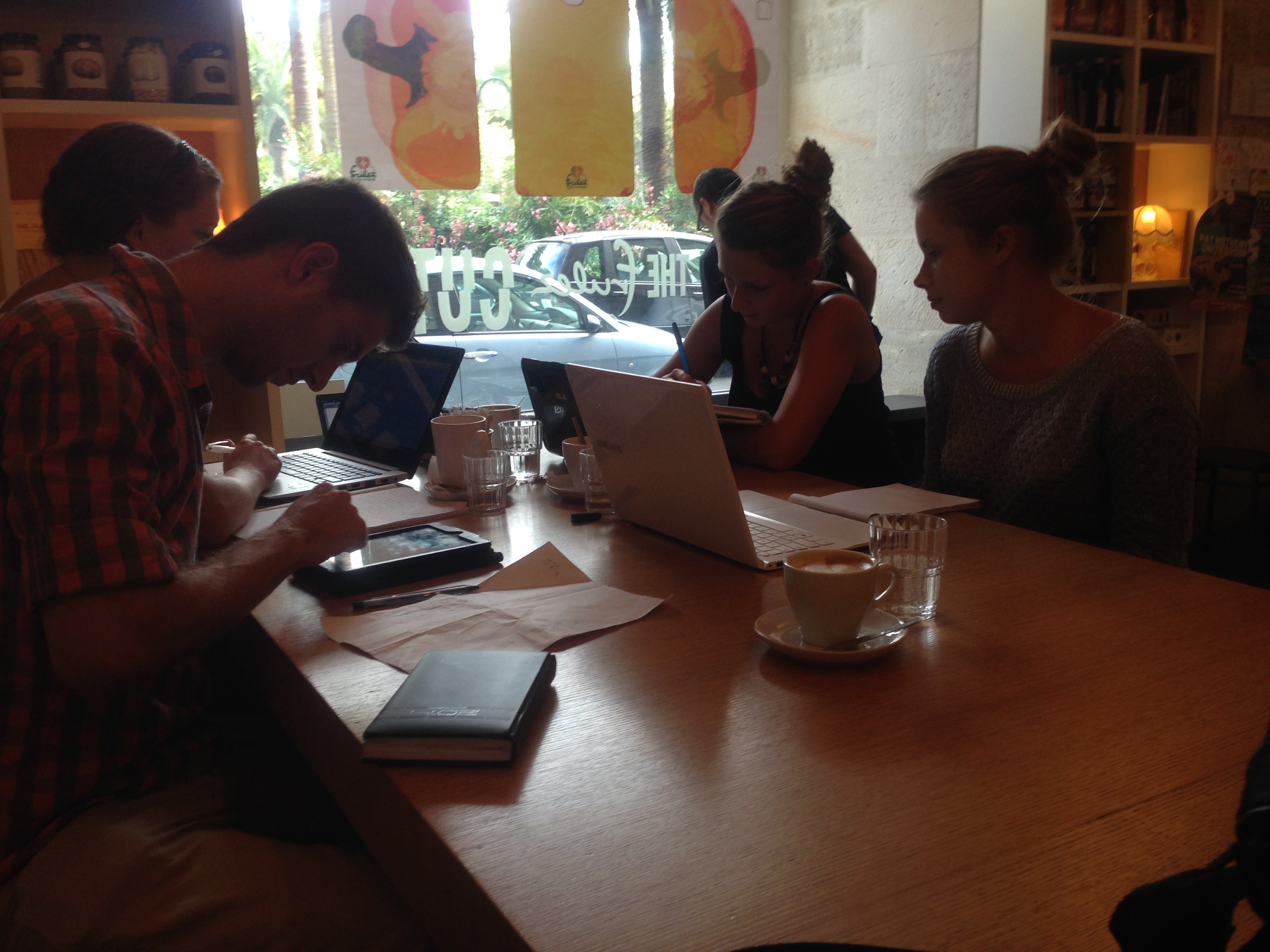 Molti giovani che lavorano tranquilli al computer o sui tablet.