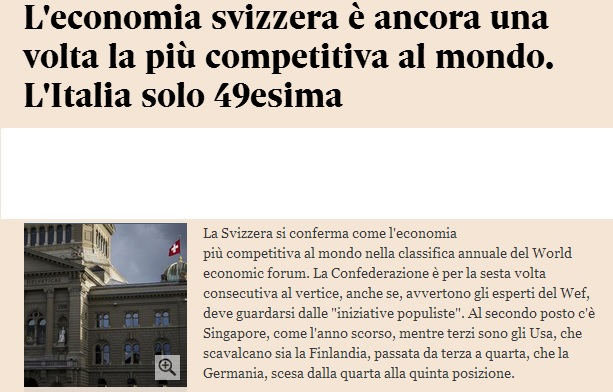 “….La Svizzera ha come punti di forza la trasparenza delle istituzioni, la capacità di innovazione e ricerca, la buona cooperazione fra il settore pubblico e quello privato, afferma il Wef.