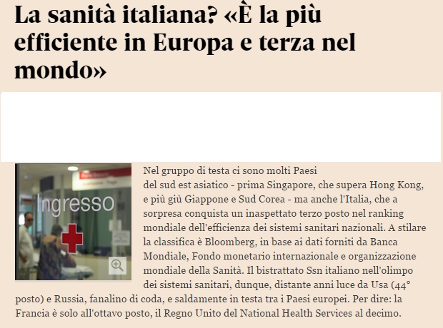 La classifica di efficienza dei sistemi sanitari elaborata da Bloomberg mette in fila 51 paesi tra quelli con popolazione superiore ai 5 milioni, prodotto interno lordo di almeno 5mila dollari Usa e un’aspettativa di vita superiore ai 70 anni. Tra i parametri presi in considerazione l’aspettativa di vita, la percentuale di spesa sanitaria sul totale del pil e spesa totale pro-capite per la Sanità, sintetizzati in un parametro generale di efficienza che nel caso di Singapore segna 78,6 punti, 77,5 per Hong Kong e 76,3 per l’Italia; staccati Giappone (68,1), Sud Corea (67,4) ed Australia (65,9).