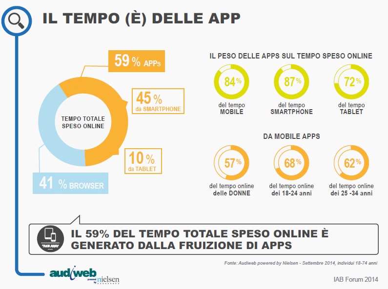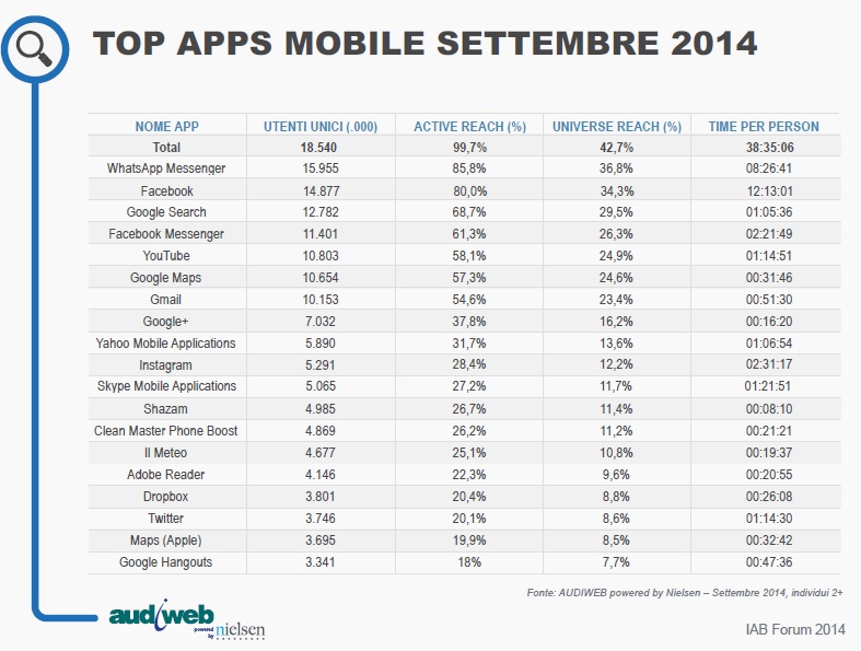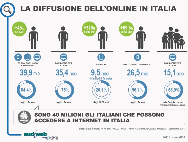 Oggi, in base ai nuovi dati Audiweb sull’uso di internet a settembre 2014, Audiweb Database, la total digital audience è rappresentata da 21 milioni di utenti unici (2+ anni) nel giorno medio, collegati per 2 ore per persona.