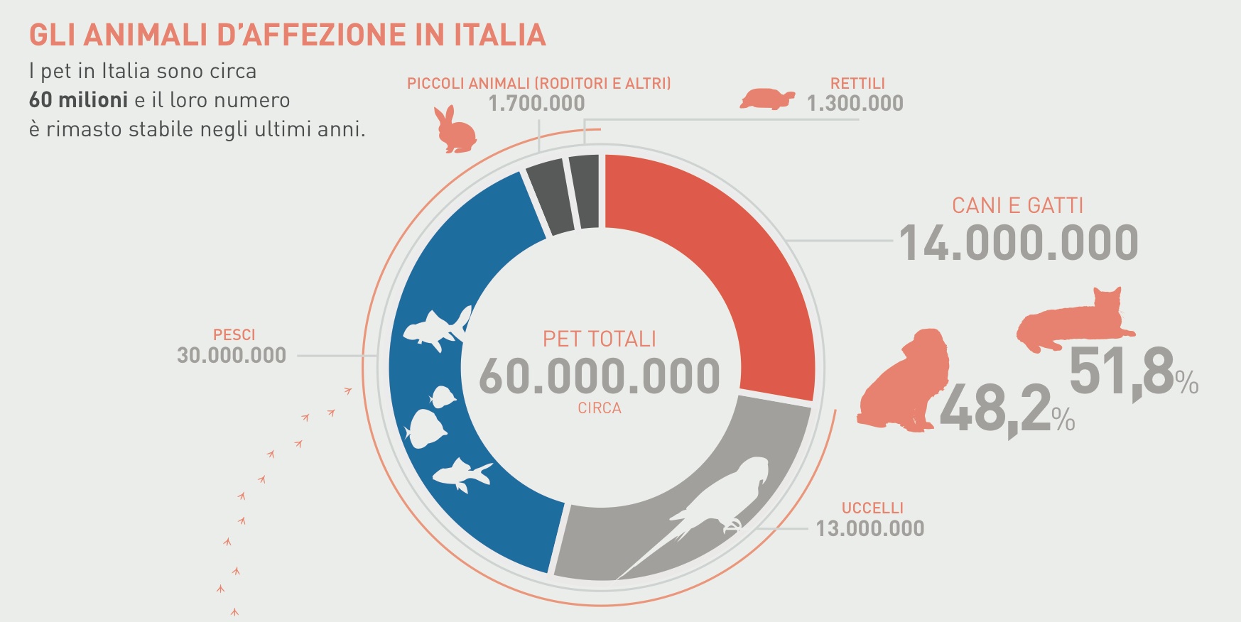 Sono 60 milioni. Per l’esattezza 14 milioni fra cani (48,2%) e gatti (51,8%) e 46 milioni mettendo insieme tutti gli altri.