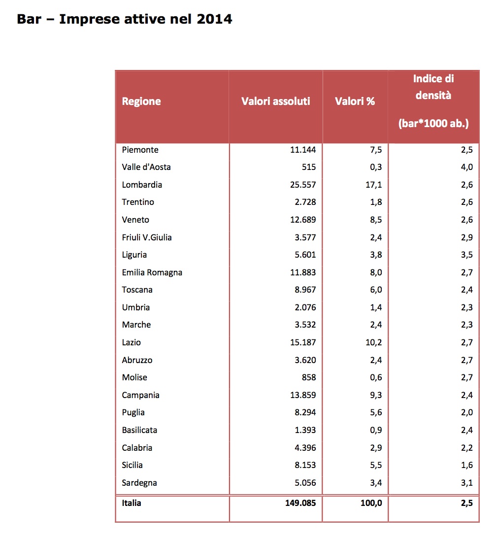 La FIPE Confcommercio ha pubblicato i dati sui bar in Italia nel 2014.