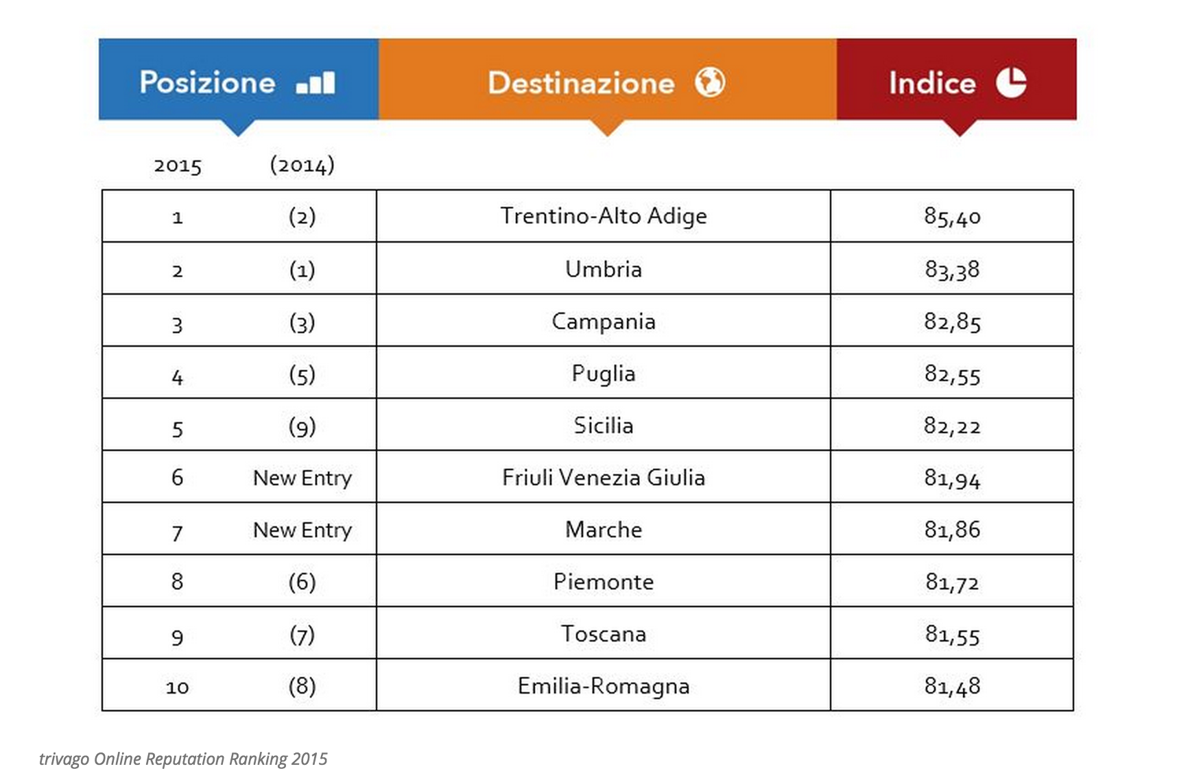 Con un rating di 85,40 punti su 100, il Trentino-Alto Adige è l’area che ha raccolto la quota maggiore di recensioni positive, davanti a Umbria (83,38) e Campania (82,85). Tra le novità della classifica 2015 l’ingresso nella top 10 del Friuli Venezia Giulia (81,94) e delle Marche (81,86), rispettivamente sesta e settima. A farne le spese sono il Veneto e la Sardegna, che scivolano fuori dalla graduatoria pur mantenendo valutazioni superiori agli 80 punti.