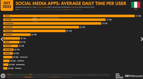 Per quanto concerne il tempo medio giornaliero di uso, Tik Tok comanda la classifica anche in Italia.