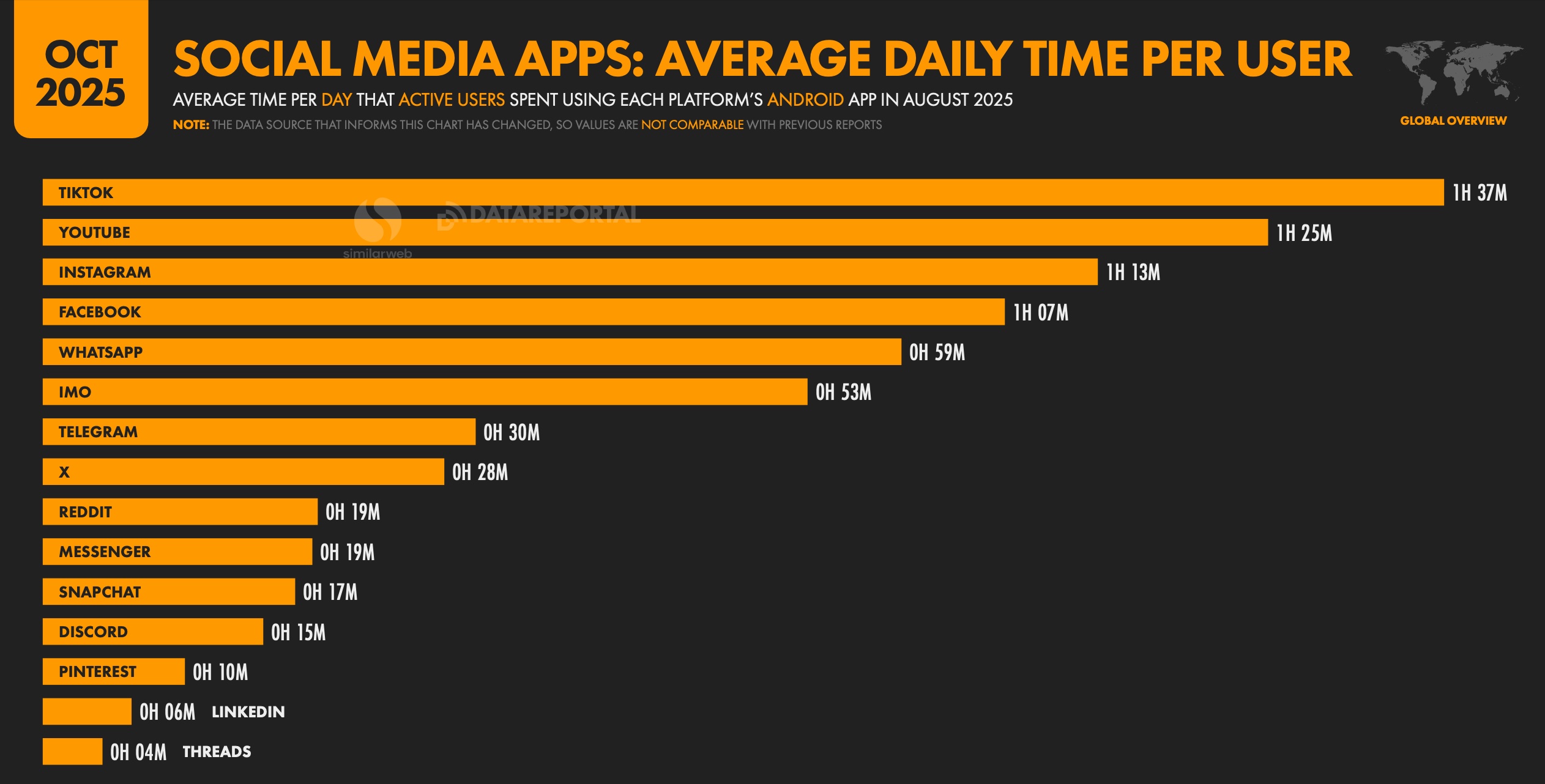 Tik Tok domina la concorrenza con una media giornaliera di 1 ora e 37 minuti.