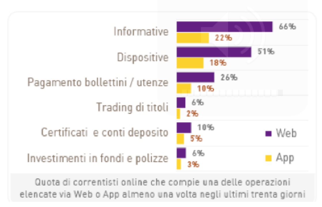 L’accesso prevalente è via web (76%) tramite PC (81%) per una media di 2,5 volte al mese, ma cresce in modo sempre più importante la fruizione in mobilità: il 21,8% (pari a circa 3 milioni) dichiara di usare con regolarità l’App della propria banca principalmente per operazioni informative o dispositive.