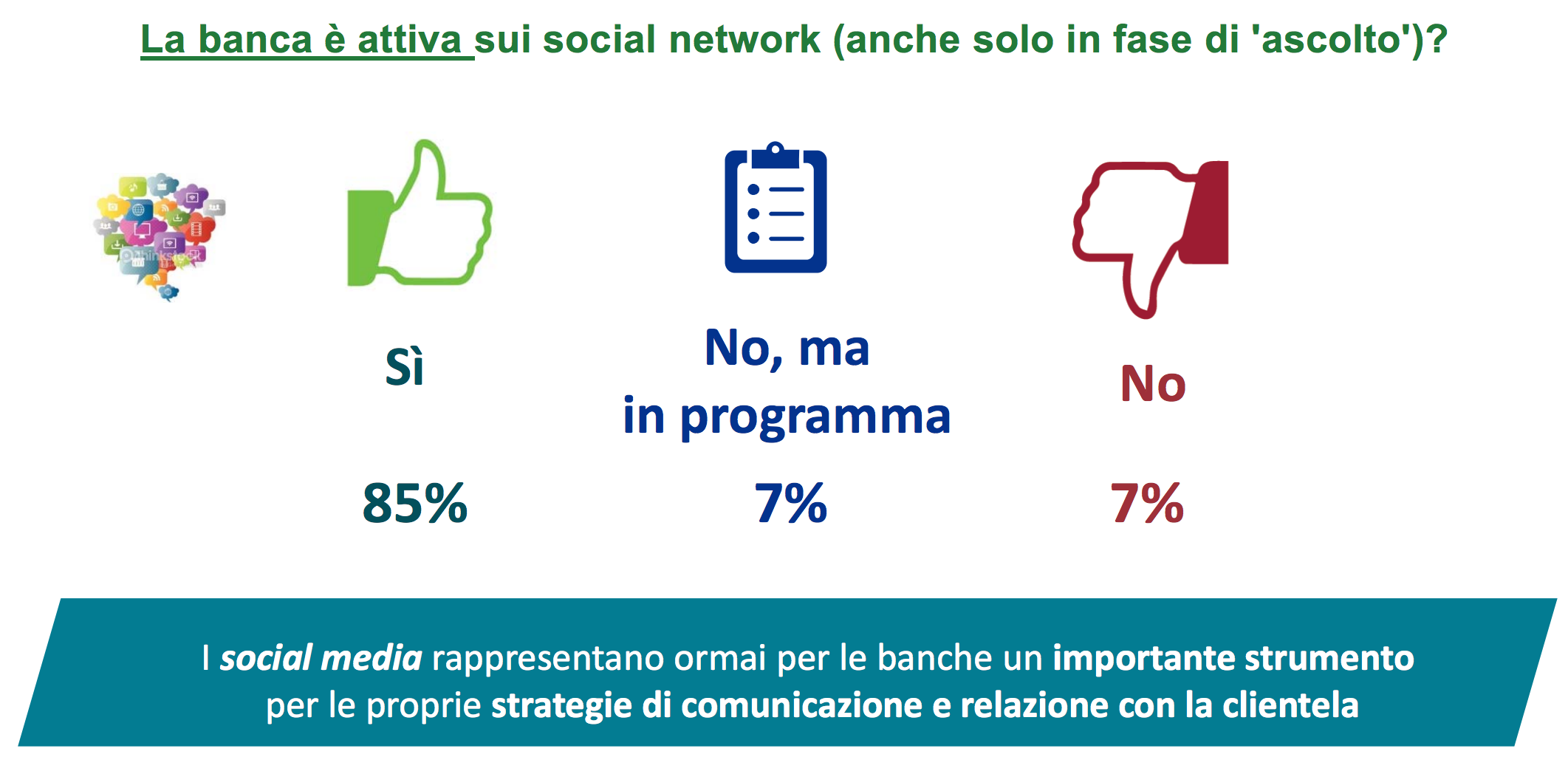 L’85% delle banche intervistate e’ presente sui canali social e un ulteriore 7% e’ pronto ad esserlo nel prossimo anno.