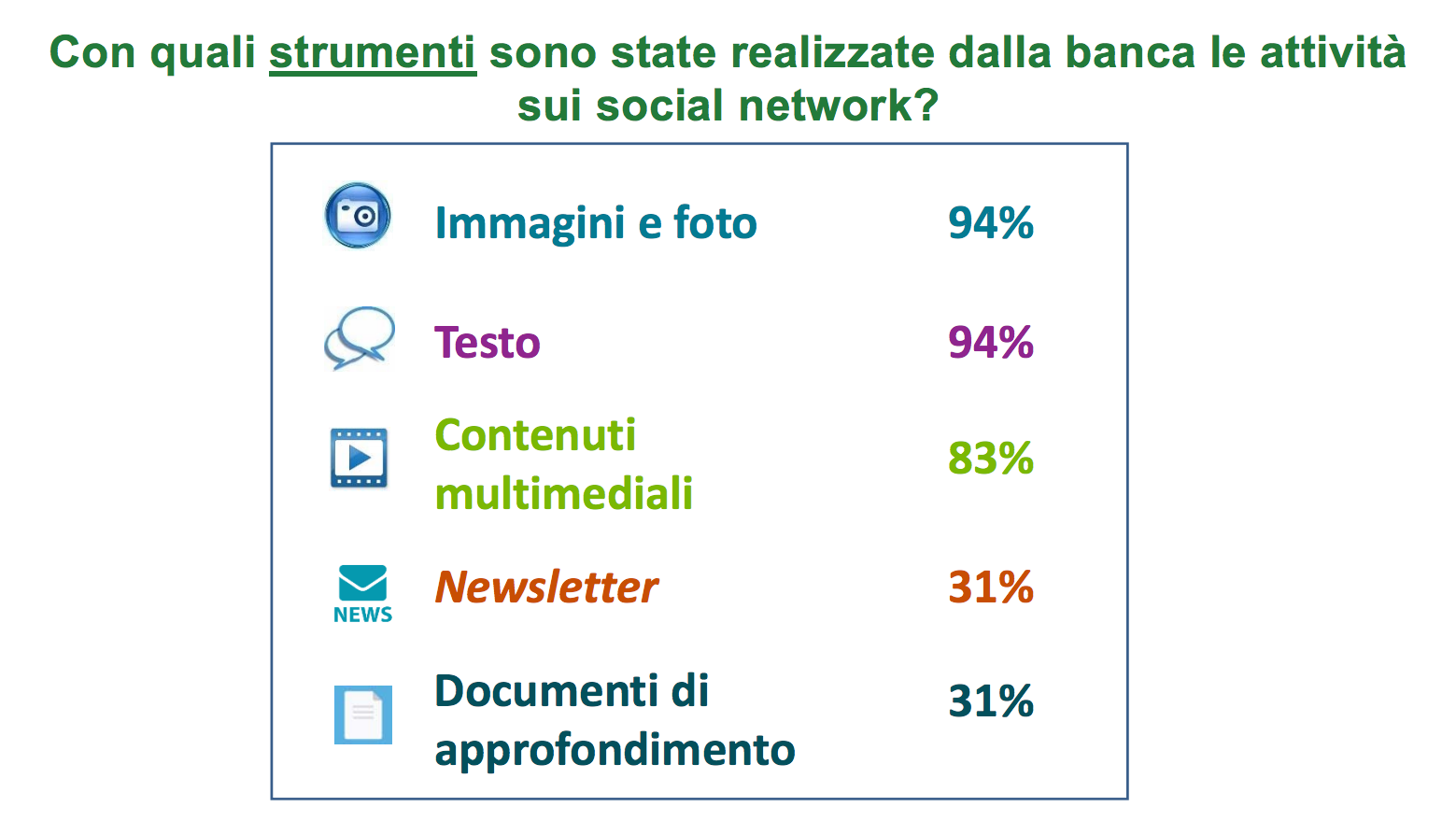 Gli strumenti piu’ usati dalle banche per comunicare sui social network sono immagini e foto, post di solo testo e contenuti multimediali virali, come i video, che sono utilizzati dall’83% delle banche.