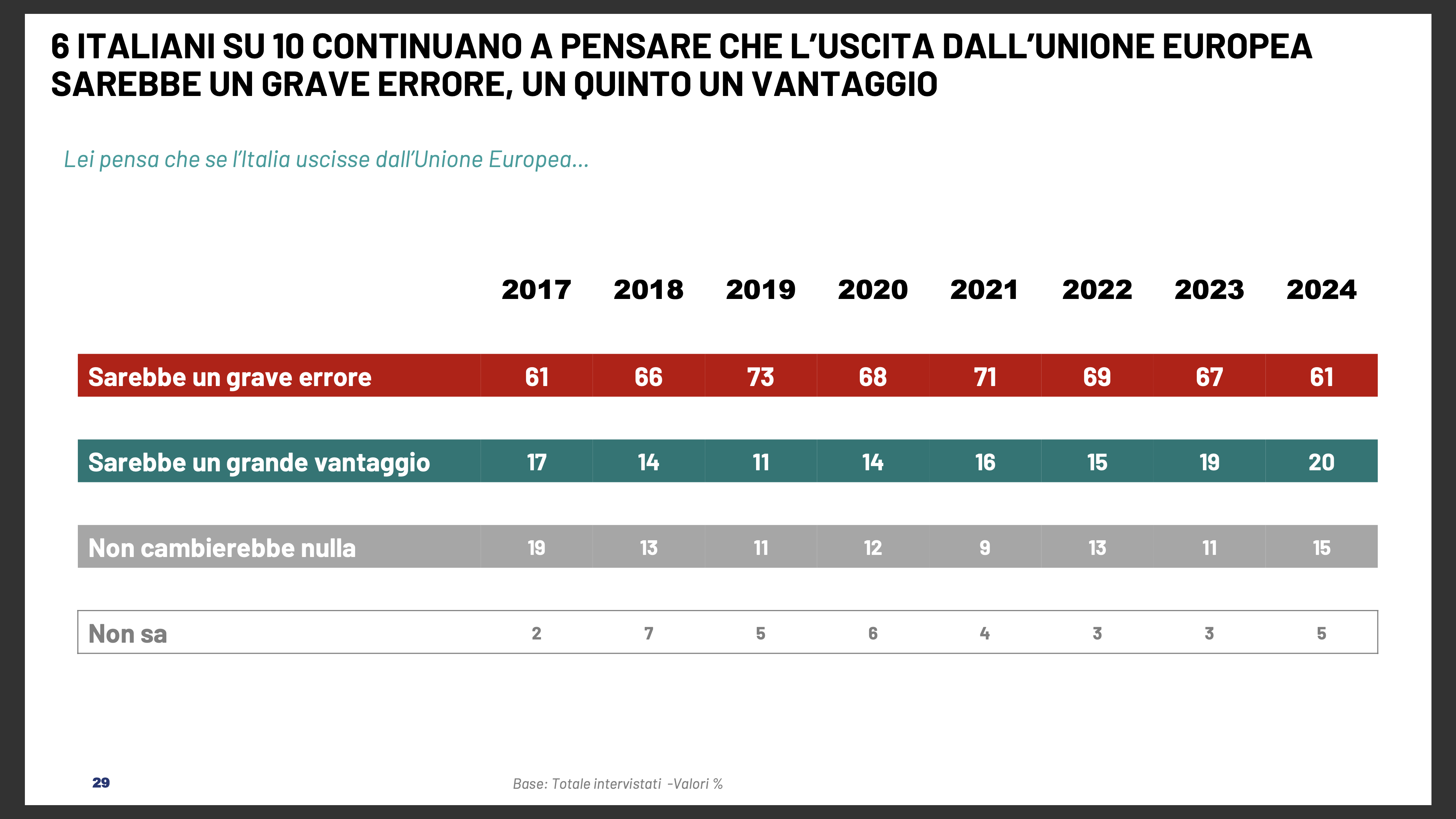 Ciò nonostante, la maggioranza degli italiani continua a ritenere che l’uscita dall’UE sarebbe un grave errore (61%).