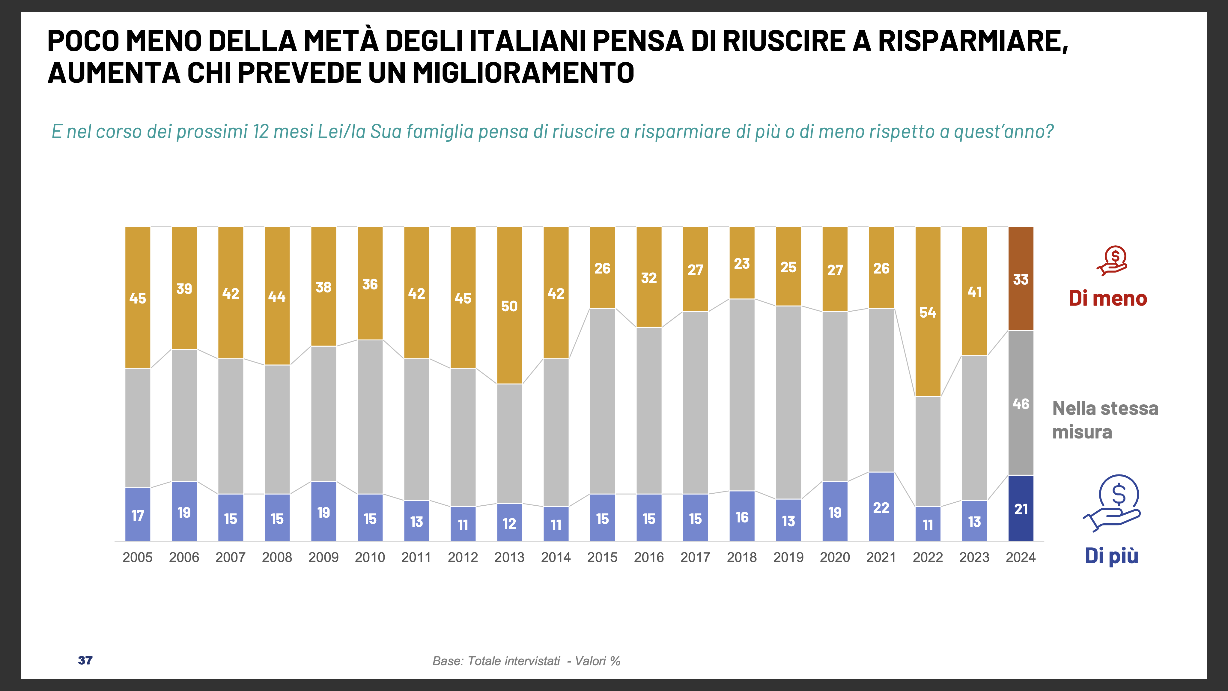 Migliora la percentuale di chi ritiene in crescita la propria capacità di risparmio.