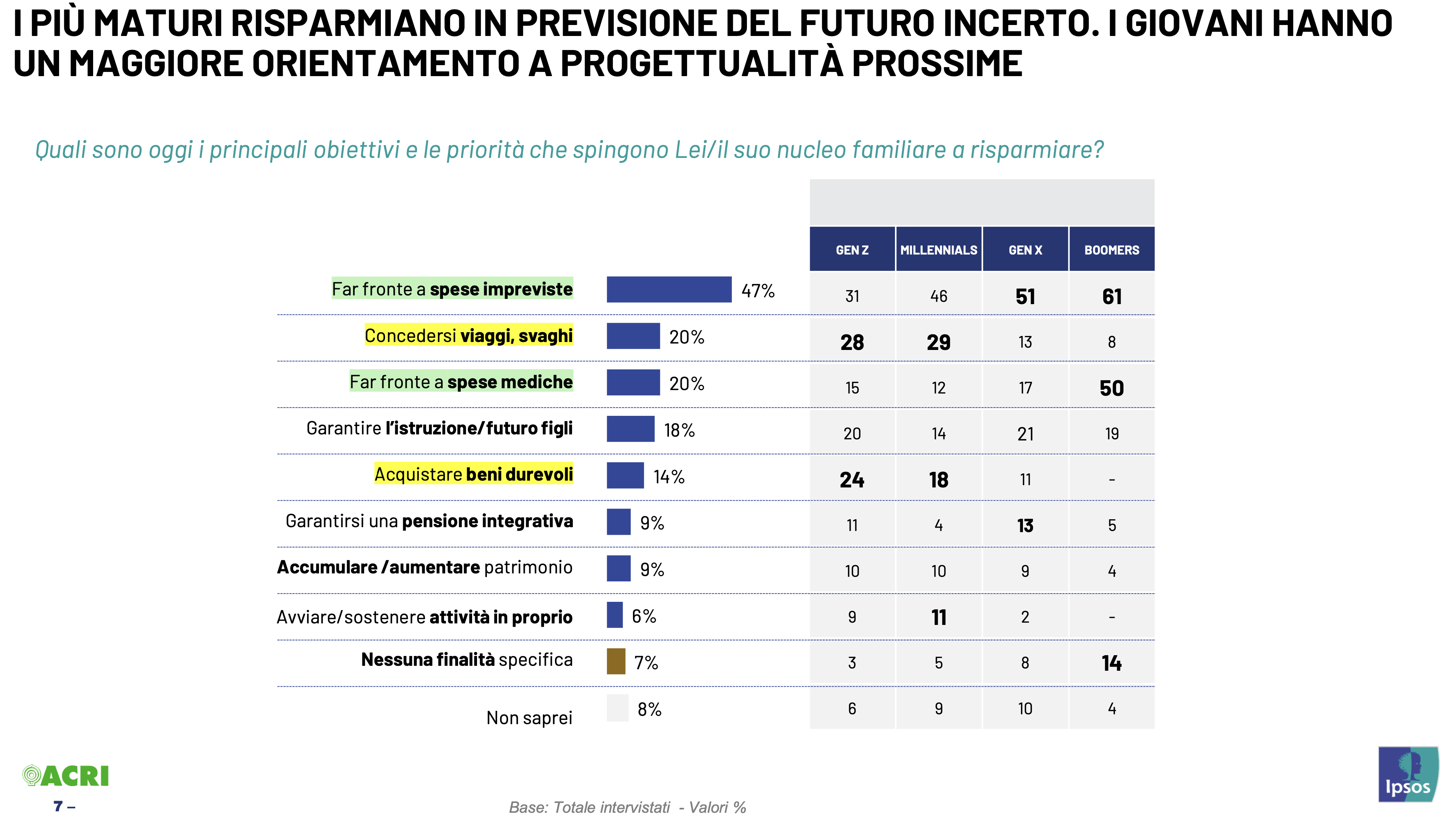 Oggi, il risparmio è considerato principalmente come una necessità per garantire tranquillità e stabilità economica (per il 38% degli italiani), specie dai Boomers, presso i quali il dato raggiunge il 46%. In seconda battuta è un’opportunità per raggiungere specifici obiettivi.