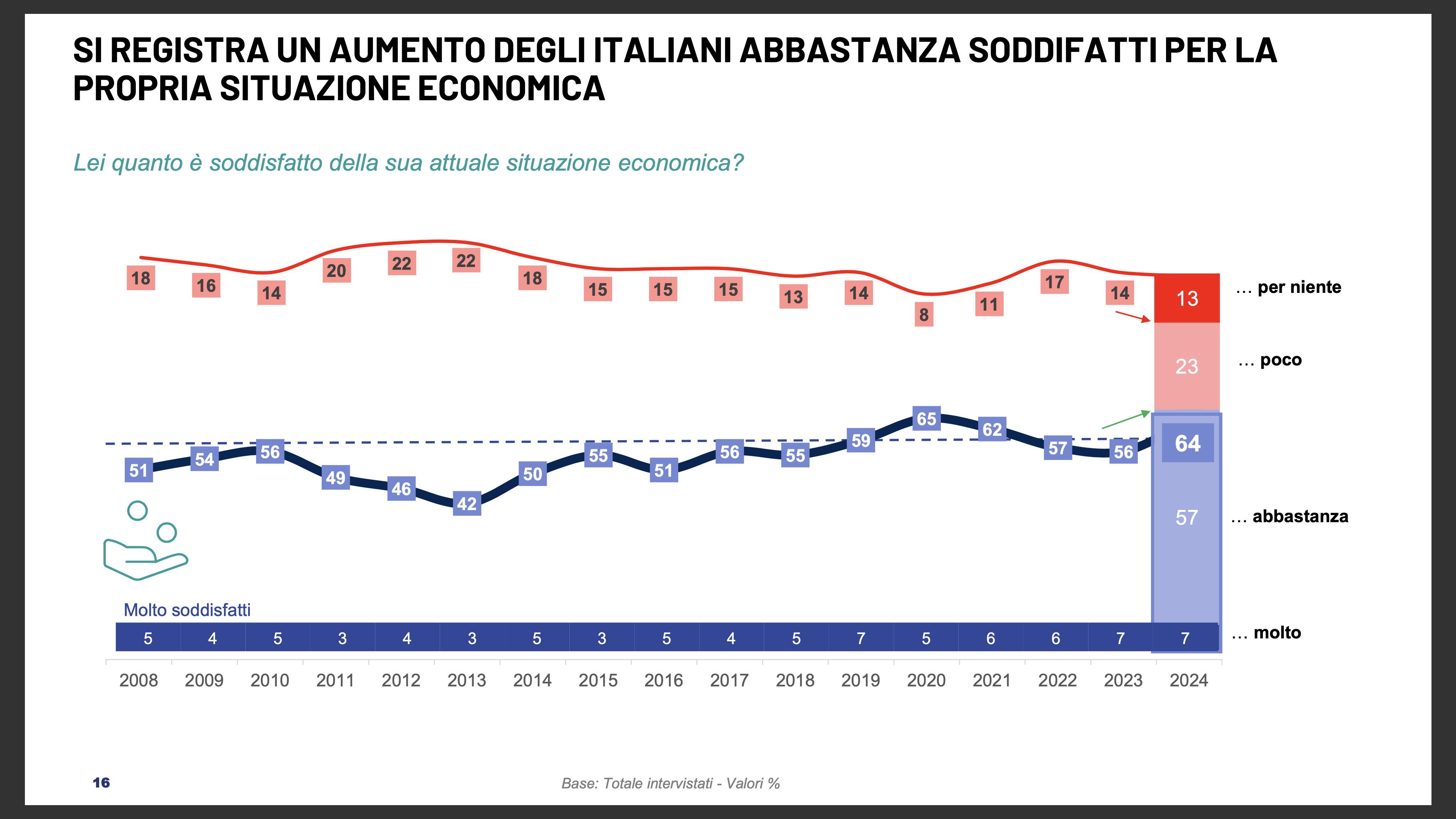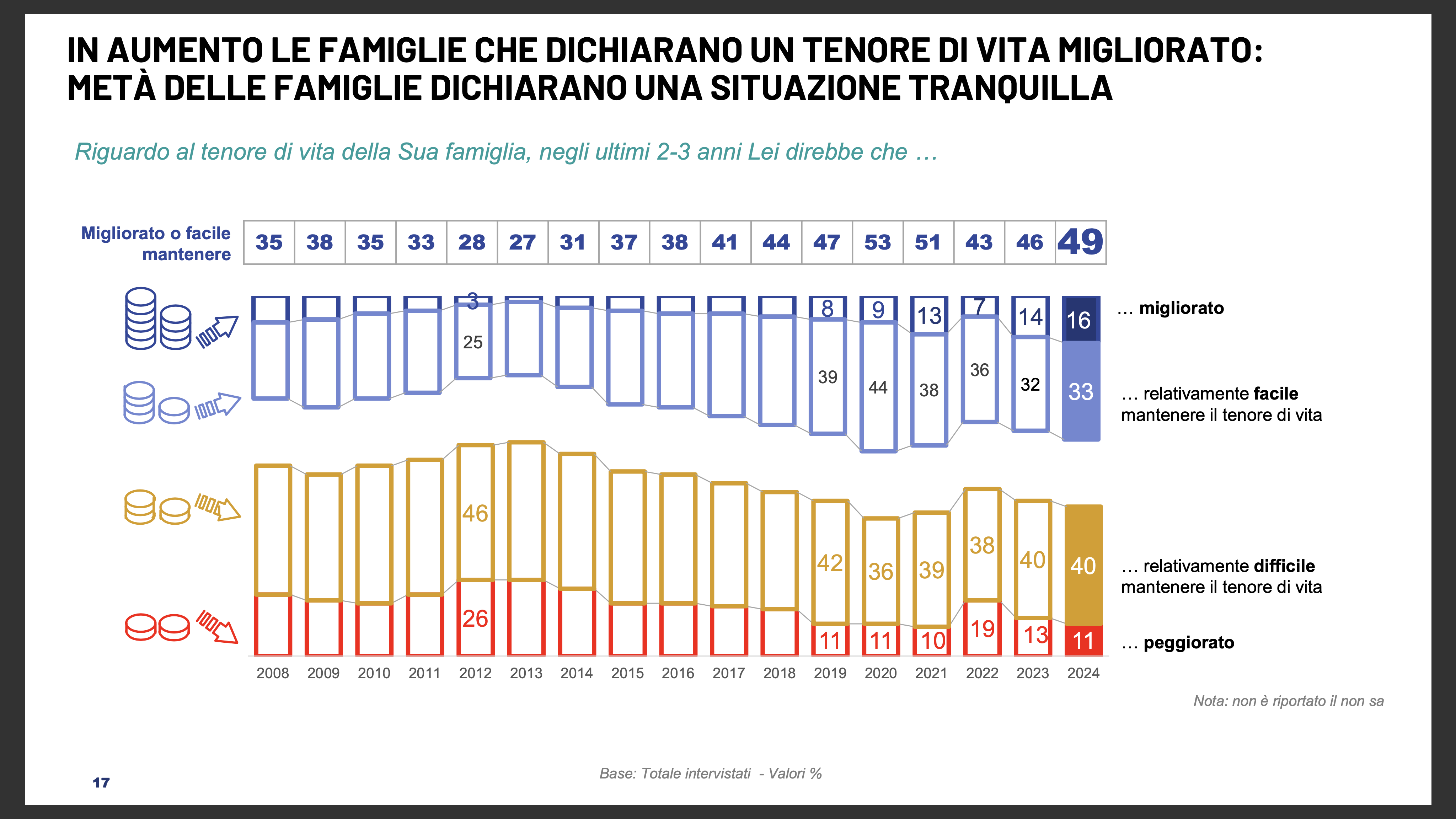 Lo studio Acri-Ipsos evidenzia un miglioramento del tenore di vita delle famiglie, che si attesta su livelli superiori a quelli pre-pandemia (49% le famiglie che dichiarano un tenore di vita migliorato o più facile da mantenere vs 44% nel 2018). I soddisfatti per la propria situazione economica salgono quindi dal 56% al 64%.