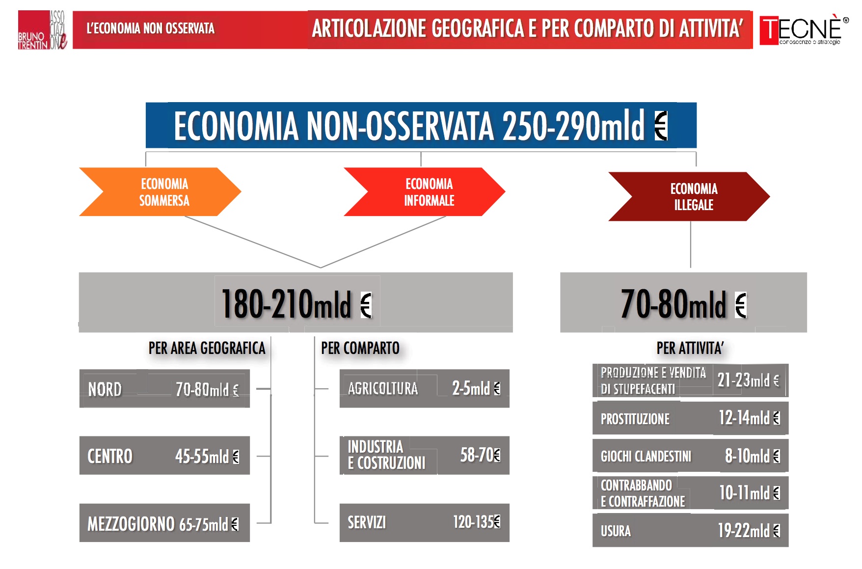 Di questi, 180-210 miliardi riguardano l’economia sommersa ed informale (con un mancato gettito tra 85 e 100 miliardi) e 70-80 miliardi l’economia illegale.
