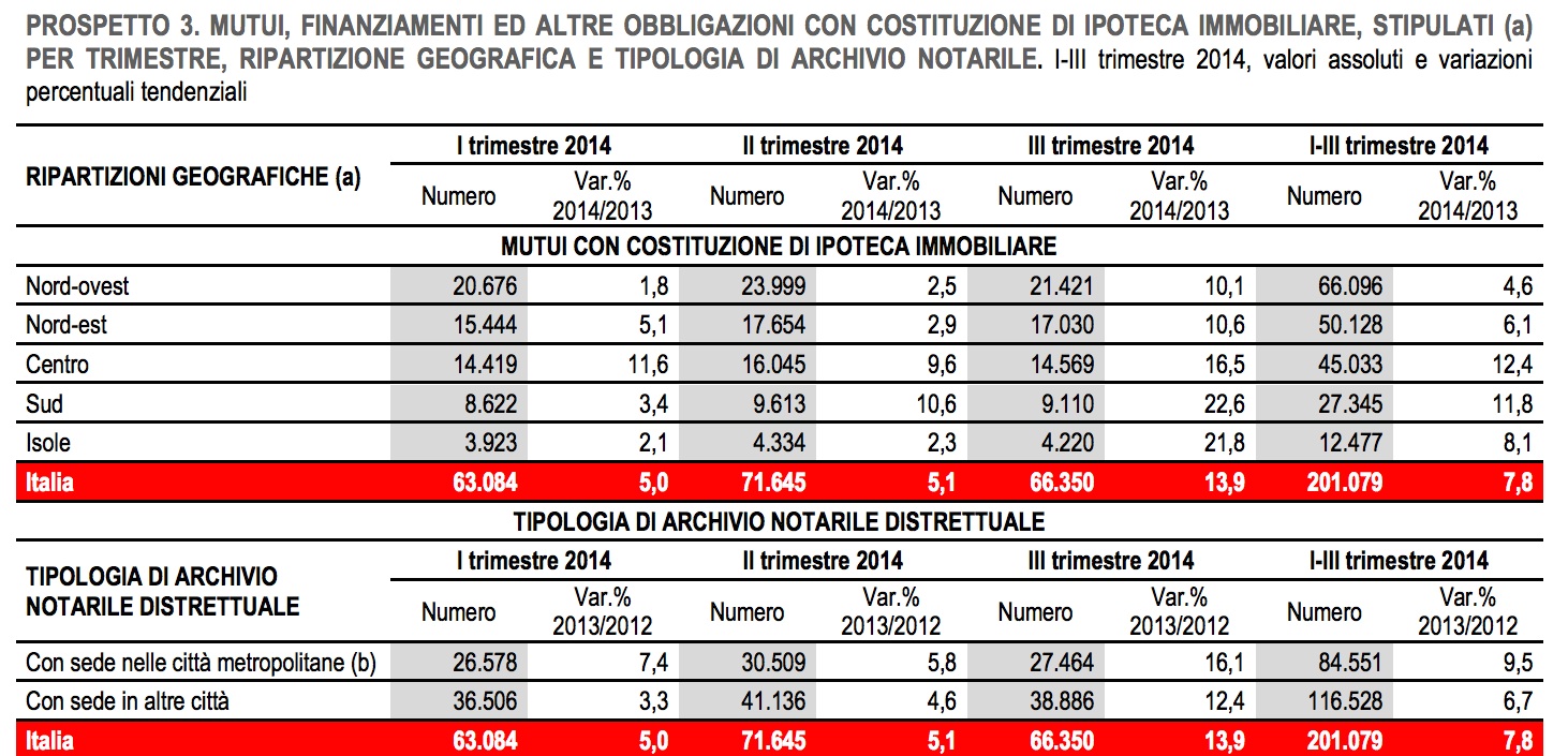 Nel III trimestre 2014 i mutui, i finanziamenti e le altre obbligazioni con costituzione di ipoteca (66.350) registrano un forte aumento (+13,9%, per un totale di 66.350 mutui).