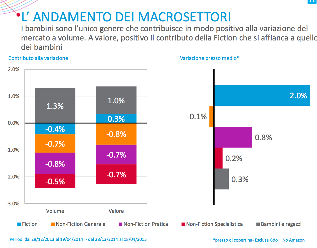 Il settore, relativamente ai soli canali trade (librerie, librerie online, grande distribuzione, escluso Amazon) nei primi quattro periodi dell’anno (da gennaio al 18 aprile), ha fatto segnare un -2,6% a valore (fatturato) e un -4% a volume (copie), dimezzando i valori negativi dello stesso periodo del 2014.