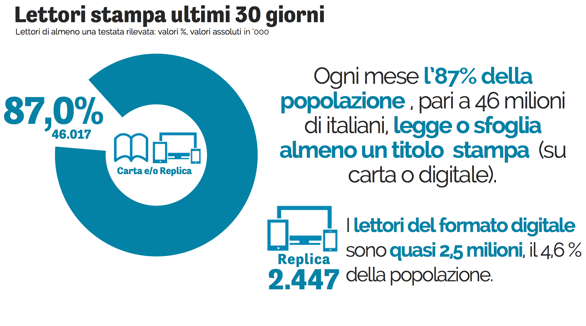 Con più di 46 milioni di lettori ogni mese (quasi il 90% della popolazione), la stampa si conferma un mezzo capace di raggiungere tutti i segmenti della popolazione.