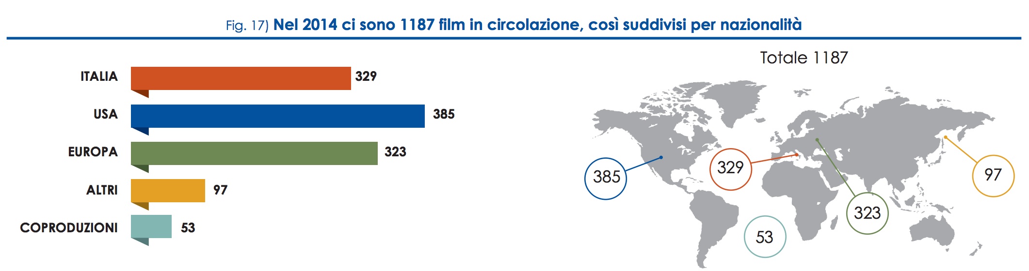 Da un lato il settore della produzione continua a mostrare un aumento significativo del numero dei film italiani prodotti, segno della moltiplicazione delle opportunità: 201 titoli hanno ricevuto nel 2014 il nulla osta alla pubblica proiezione, di cui 194 di iniziativa italiana, in aumento rispettivamente di 34 e 38 rispetto al 2013.