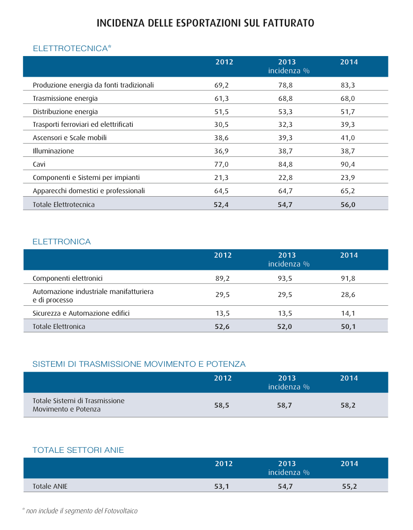 Dei 55 miliardi di euro registrati a fine 2014, 30 miliardi sono stati originati dalla vendita dei prodotti dell’eccellenza delle tecnologie made in Italy sui mercati esteri, con un’incidenza sul giro d’affari pari al 55%.