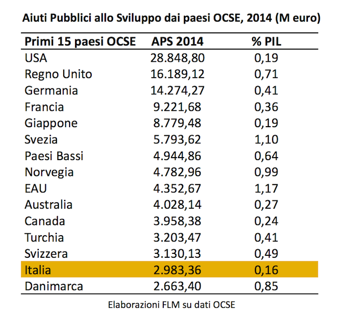 Il report ci ricorda anche che l’Italia non è fra i contribuenti più attivi sui programmi di sviluppo all’estero.
