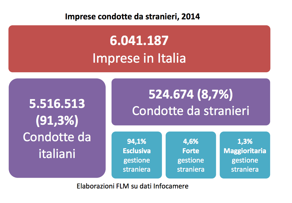 Le imprese gestire da imprenditori stranieri ammontano a 524.674 e sono pari all’8,7% del totale.