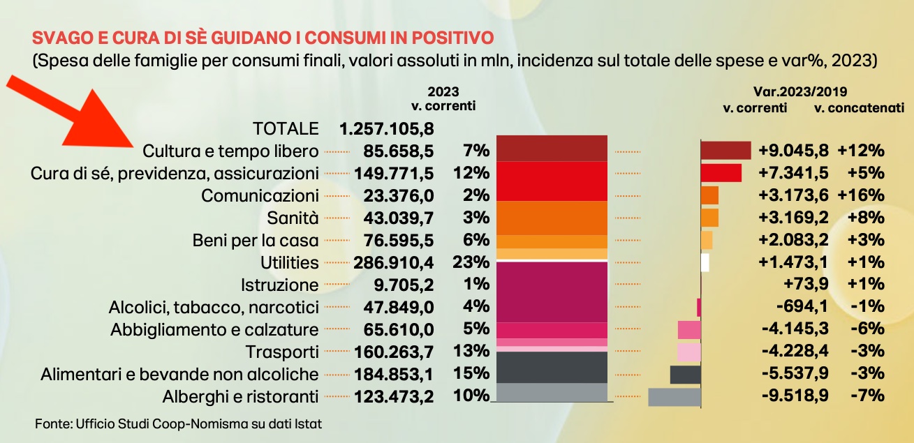 Cultura, tempo libero e cura del proprio corpo sono i comparti che crescono di piu’.