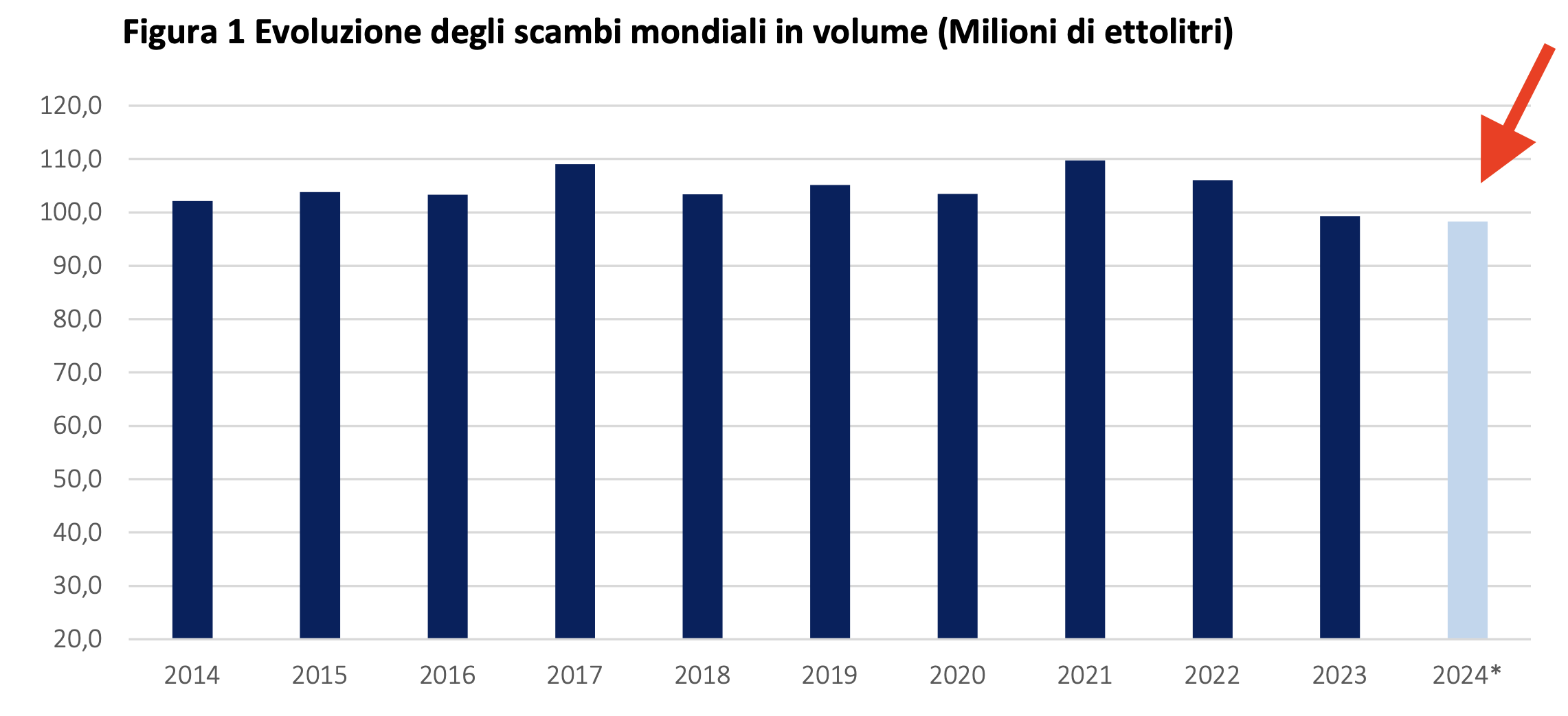 Le esportazioni mondiali in volume sono scese sotto la soglia dei 100 milioni.