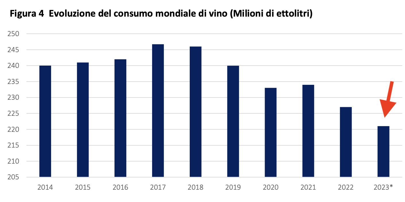 Relativamente ai consumi di vino, quelli globali nel 2023 sono scesi al livello di 221 milioni di ettolitri, con una contrazione del 2% rispetto al 2022, confermando il trend decrescente iniziato nel 2017, interrotto in modo effimero solo nel 2021.