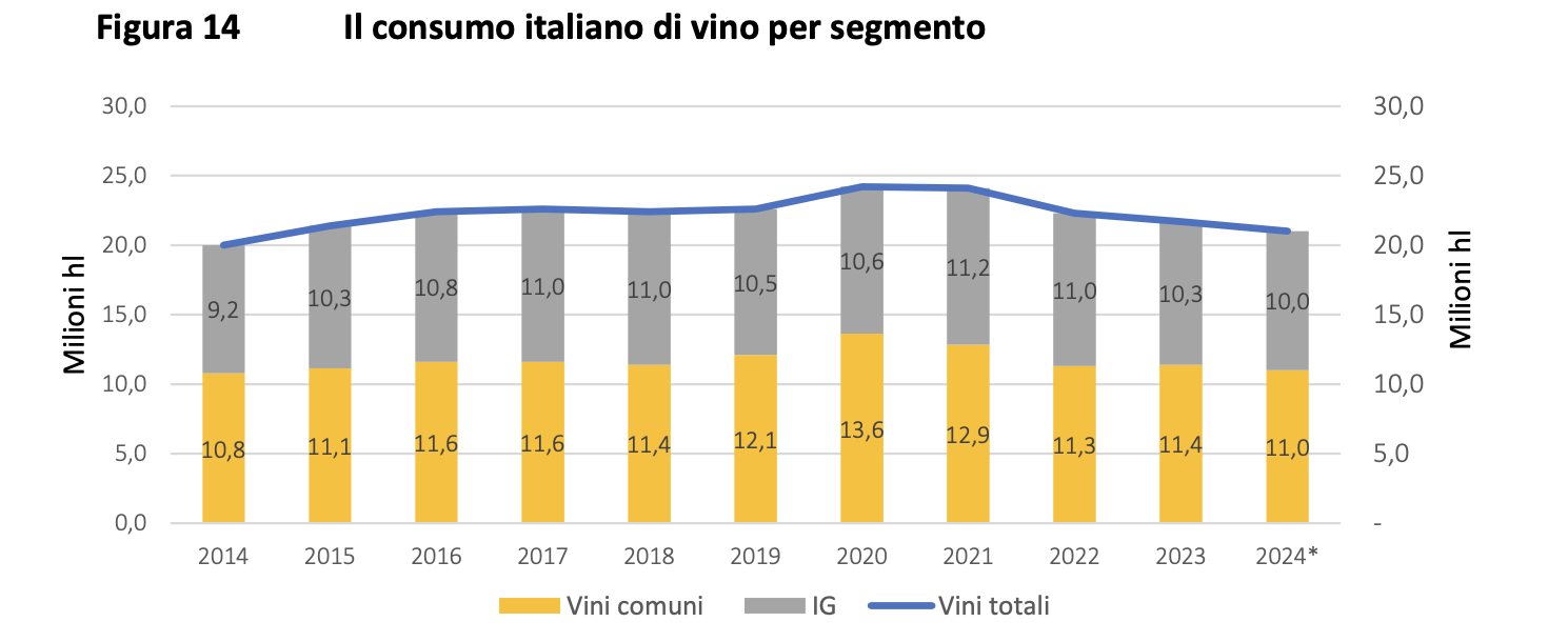 Sono mutati gli stili di vita e di consumo del vino portando a radicali cambiamenti nel paniere della domanda, sempre più orientata al segmento dei vini IG con un ridimensionamento dei vini comuni.