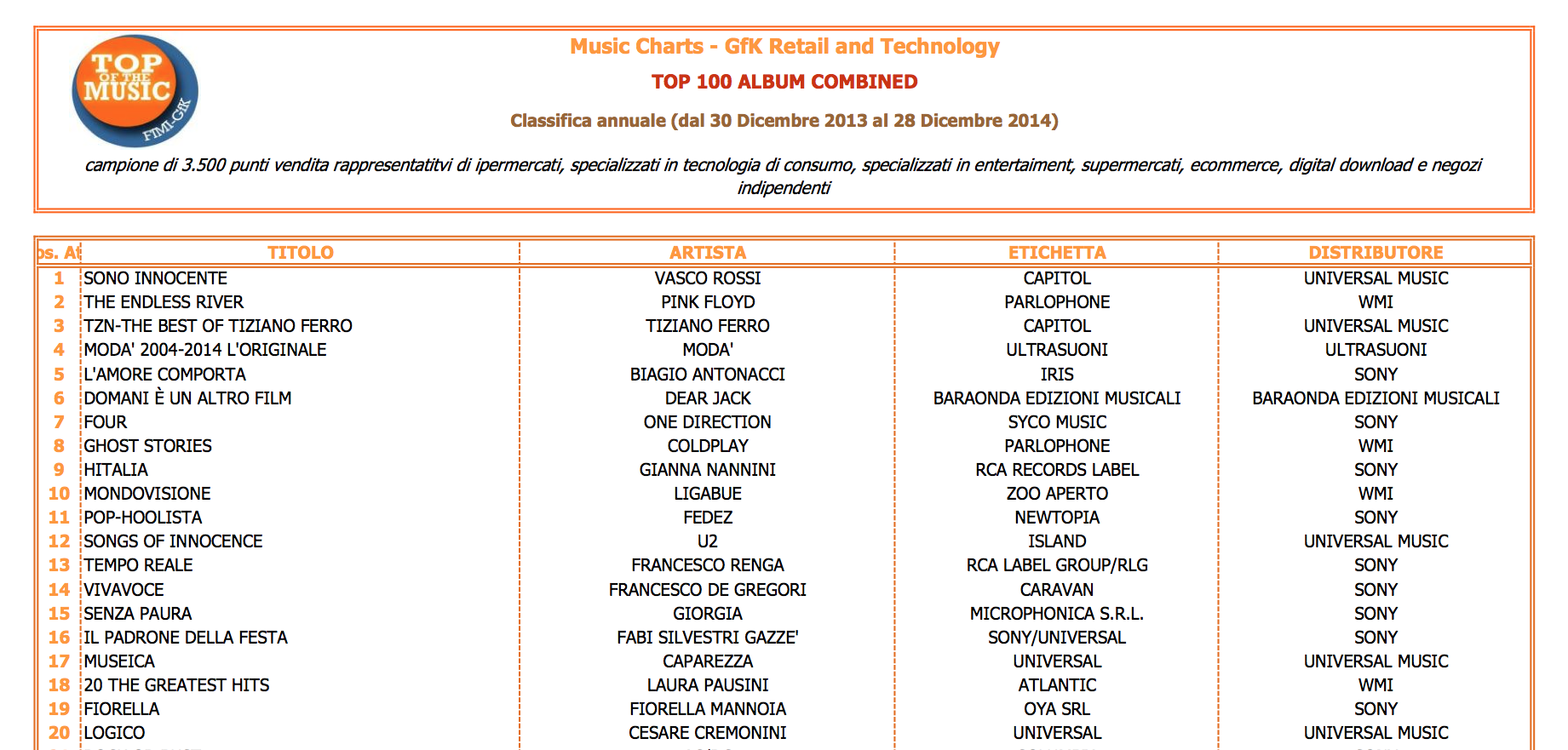 Sul sito della Fimi sono state pubblicate anche le classifiche sugli artisti che hanno venduto più album e singoli nel 2014.