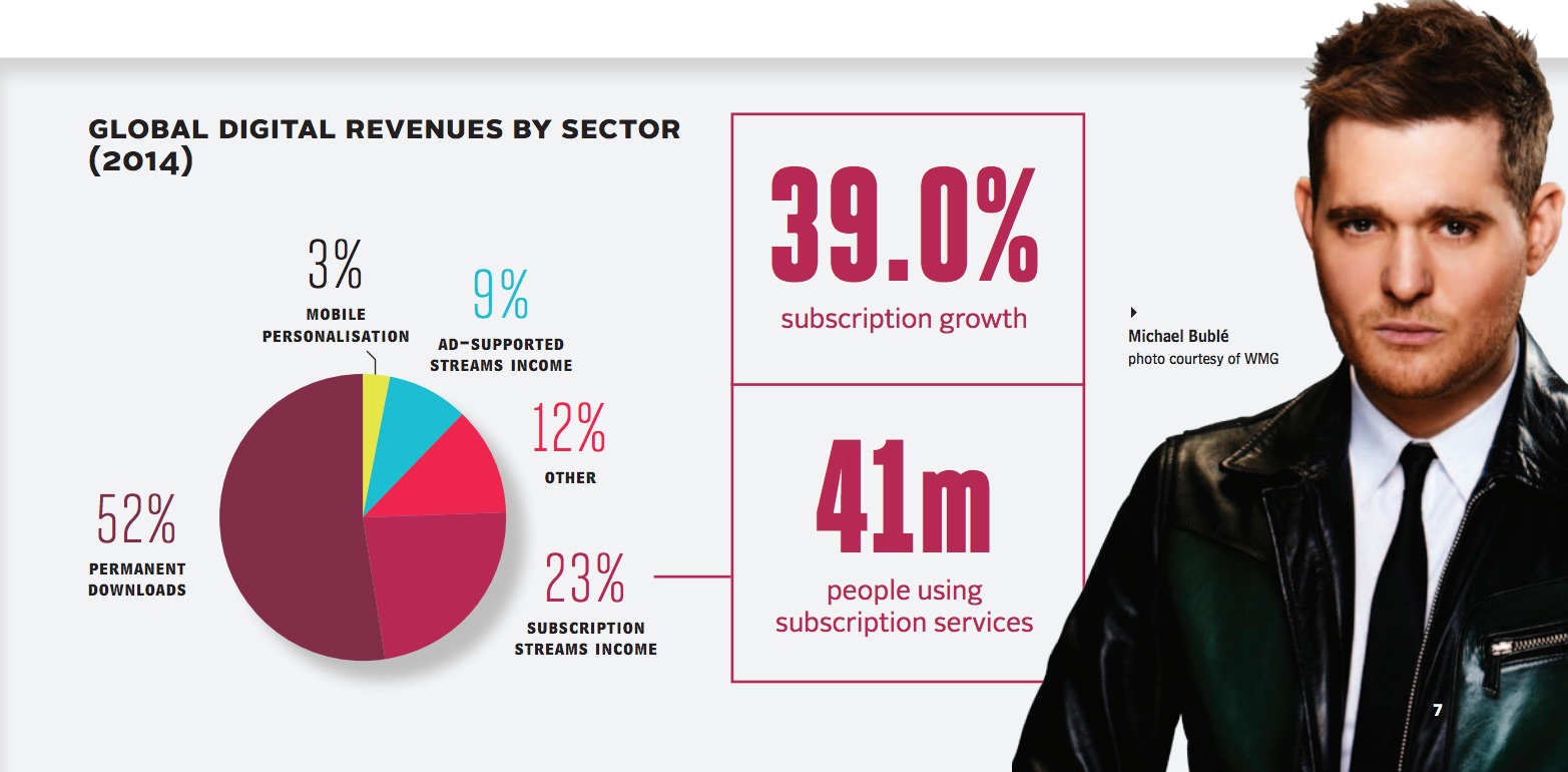 Nel 2014 sono stati incassati 6.9 miliardi di dollari, il 46 per cento del mercato globale, testimonia il Digital Music Report della IFPI, la Federazione internazionale dell’industria fonografica.