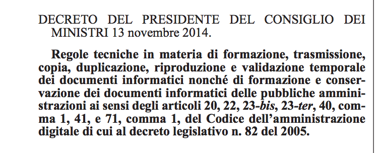 Il Decreto della Presidenza del Consiglio dei Ministri, uscito nella Gazzetta datata 12 gennaio 2014 , si intitola “Regole tecniche in materia di formazione, trasmissione, copia, duplicazione, riproduzione e validazione temporale dei documenti informatici nonchè di formazione e conservazione dei documenti informatici delle pubbliche amministrazioni“.