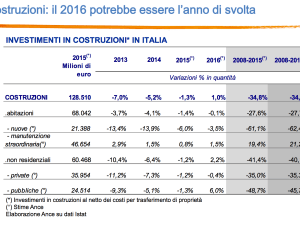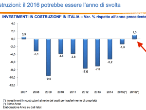 . L’Ance è l’Associazione dei costruttori italiani. . Ha pubblicato in questi giorni l’Osservatorio Congiunturale sull’industria delle costruzioni in Italia. . . Nel 2016 il mattone sarà fuori dal tunnel della crisi, trainato da una ripresa degli investimenti. . . La crescita è stimata intorno all’1% in termini reali; si interrompe finalmente il trend … Continua a leggere