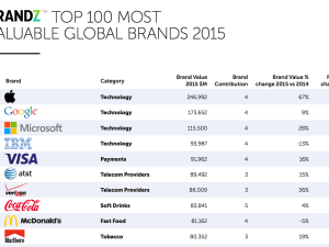 Il colosso della comunicazione WPP ha pubblicato il report MOST VALUABLE GLOBAL BRANDS 2015. In questo documento viene calcolato il valore di mercato dei primi 100 marchi al mondo. Sono i brand delle tecnologie ad occupare i primi 4 posti. I marchi tecnologici sono cresciuti in un anno del 24%, per un valore totale di … Continua a leggere