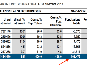 . . L’Istat ha pubblicato gli ultimi dati sulla popolazione italiana. – Prosegue nel 2017 la diminuzione della popolazione residente già riscontrata nei due anni precedenti. . Al 31 dicembre risiedono in Italia 60.483.973 persone. . 5 milioni sono i cittadini stranieri. . Complessivamente nel 2017 la popolazione diminuisce di 105.472 unità rispetto all’anno precedente. … Continua a leggere