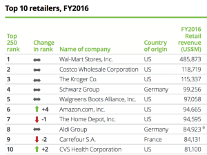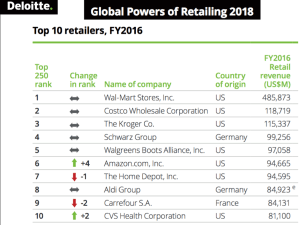 . . Deloitte presenta la ventunesima edizione di Global Powers of Retailing 2018. . Nel report vengono analizzati i risultati di bilancio resi pubblici dai più grandi retailer del mondo. . Al 1° posto come sempre abbiamo i gigante statunitense Wal Mart. . Il fatturato realizzato nel 2016 (ultimo dato disponibile) è di 485.873 milioni di … Continua a leggere